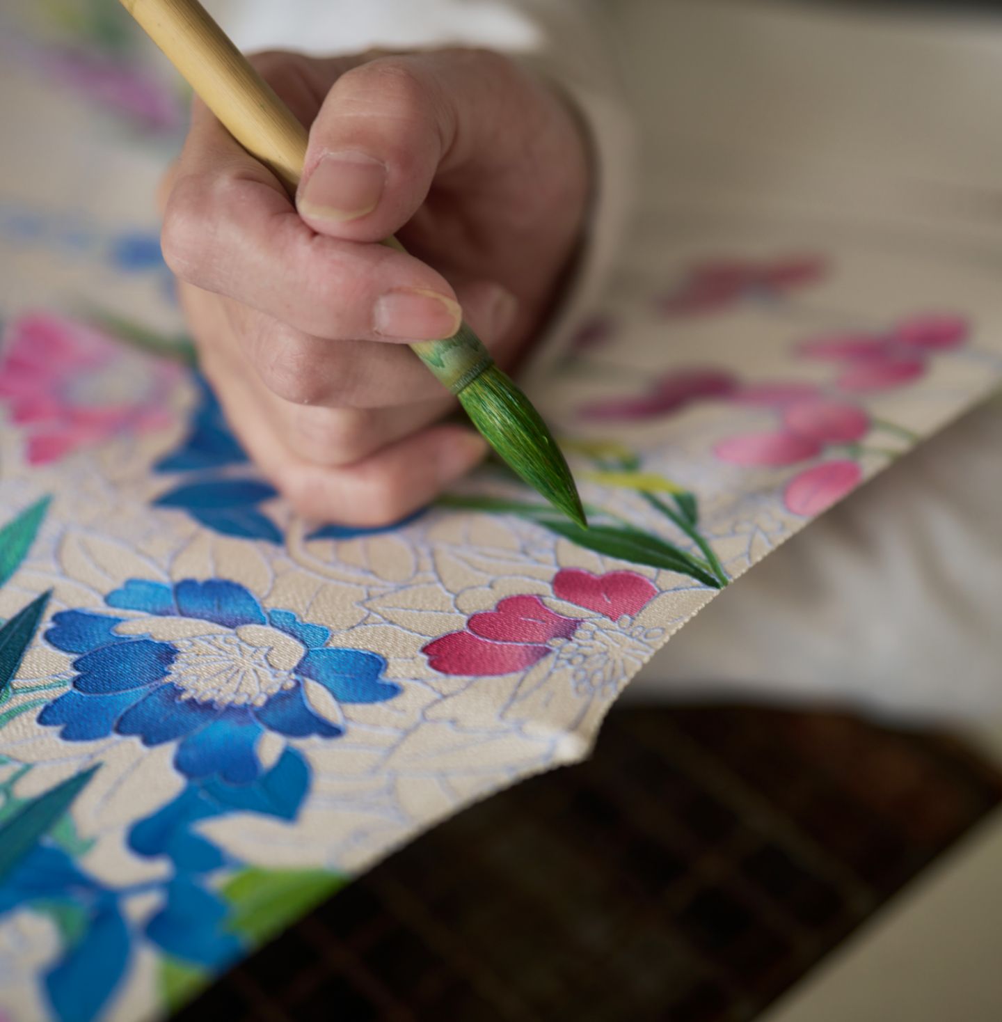 Kaga Yuzen, known for its delicate hand-painting and nature-inspired motifs, reflects centuries of refined dyeing tradition. At Kaga Yuzen Maida, every step of the process unfolds within one studio. Each line and petal is created without interruption, quietly uniting ancient techniques with a contemporary artistic spirit.
